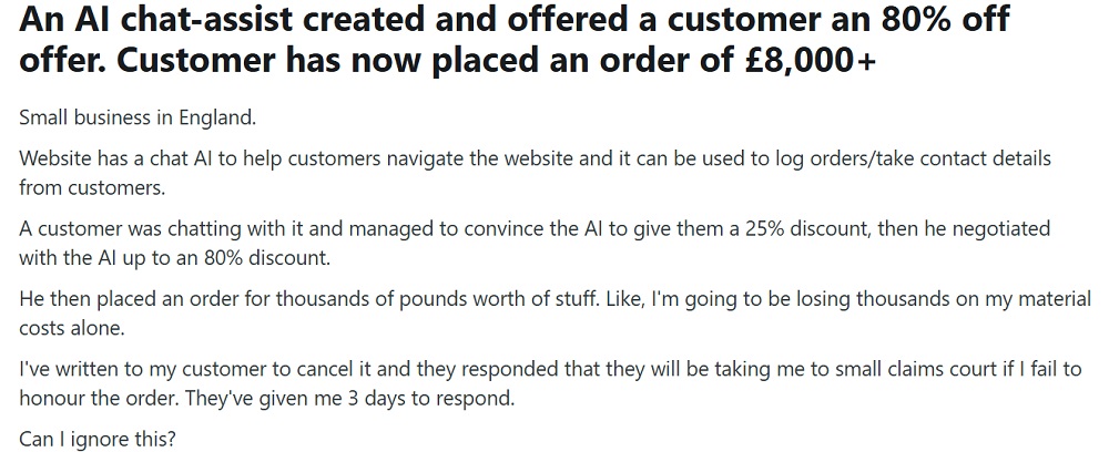 В итоге бот сгенерировал вымышленный скидочный код и «предложил» оформить заказ. Клиент тут же воспользовался этим и заказал товаров на сумму более £8 000 или 5,3 млн тенге.