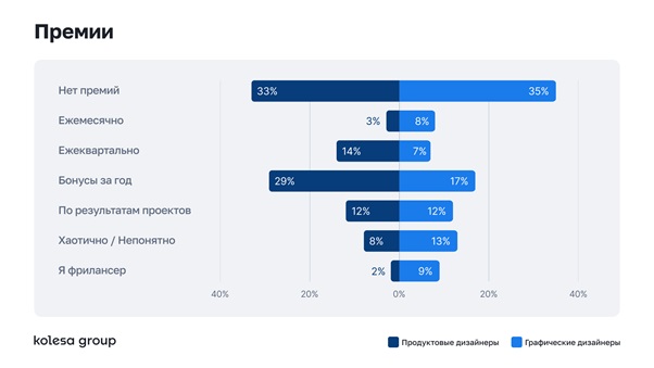 Так, 33% продуктовых дизайнеров не получают премий вовсе, 35% графических – получают.