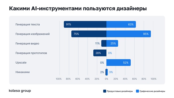 - 91% продуктовых дизайнеров используют ИИ – чаще всего для генерации текстов.