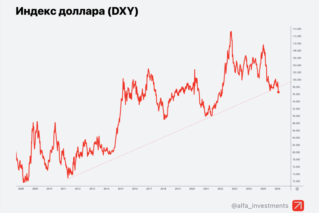 — Само понятие «индекс доллара» неоднозначное. Есть Bloomberg Dollar Index, есть классический DXY. DXY измеряет силу доллара по отношению к корзине из шести валют: евро, иена, фунт, канадский доллар, швейцарский франк и шведская крона. В этой корзине евро занимает больше половины — около 57%. С начала 2025 года евро вырос на 15% к доллару, поэтому индекс автоматически падает.