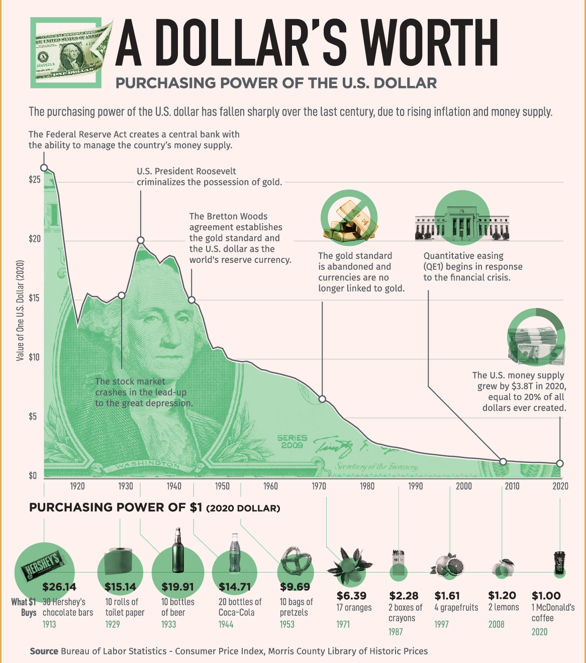 Падение покупательной способности валюты США за последние 100 лет. Автор: Visual Capitalis