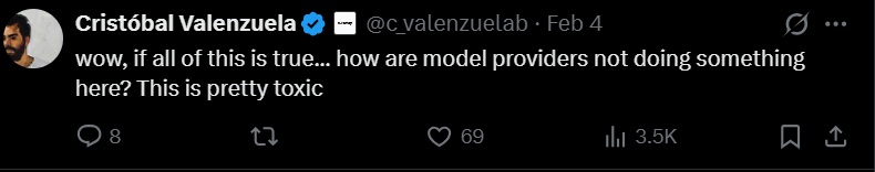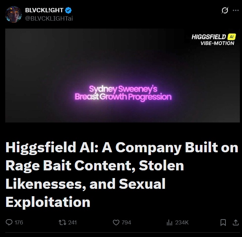 Когда конкуренты узнали об этом, на нас произошла скоординированная атака в X. Буквально в тот же день пользователь с ником BLVCKL!GHT написал пост с различными обвинениями в наш адрес, который в большинстве своем комментировали и распространяли не платящие пользователи Higgsfield AI, а сотрудники компаний-конкурентов.