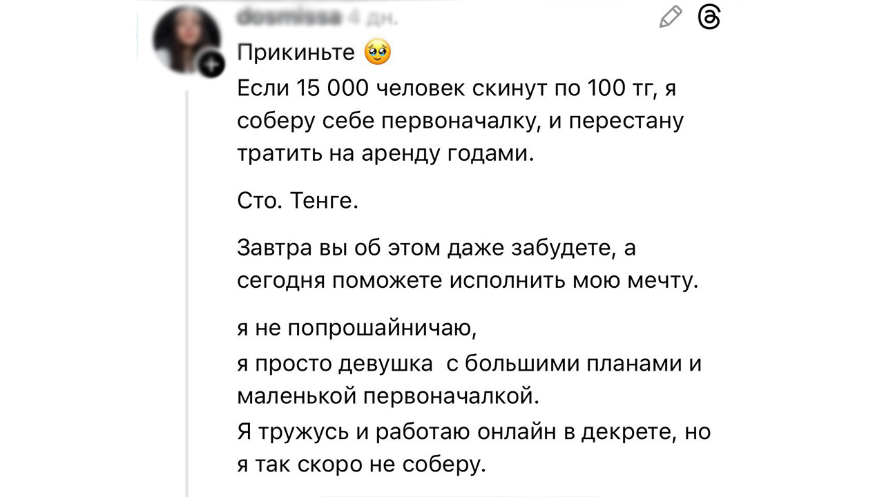 В казахстанском сегменте Threads разлетелся на первый взгляд безобидный пост. Девушка пишет: если 15 000 человек скинутся по 100 тенге, она соберет первоначальный взнос по ипотеке и перестанет тратить на аренду годами. «Всего сто тенге - сумма, которую многие тратят, не глядя. А завтра вы об этом даже забудете», — добавляет автор.