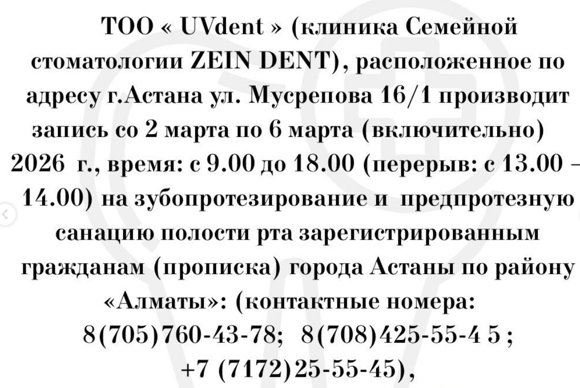 Жители района Алматы смогут записаться в клинике семейной стоматологии ZEIN DENT (ТОО «UVdennt») по адресу: улица Мусрепова, 16/1.