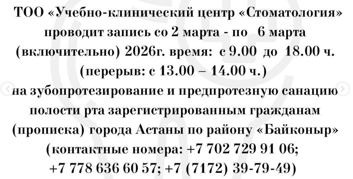 Жители района Байконыр смогут получить аналогичную помощь в ТОО «Учебно-клинический центр «Стоматология»». Запись там также пройдет с 2 по 6 марта.