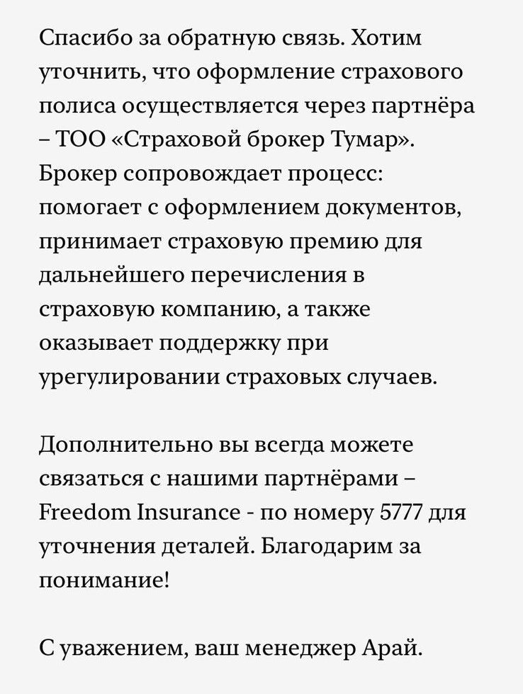 В компании пояснили, что оформление проходит через партнера - ТОО «Страховой брокер Тумар». Брокер сопровождает процесс: